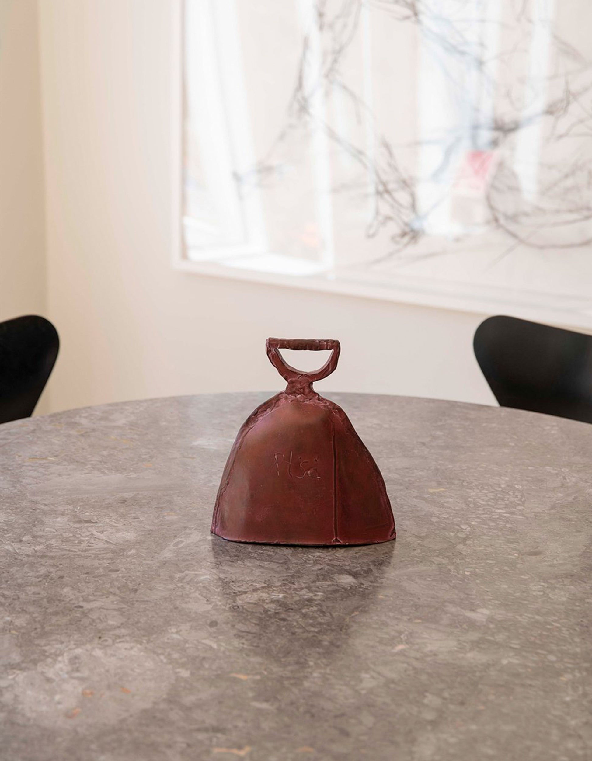 Made of a dark red patinated bronze, "Dead Bell" is a piece of skilled craftsmanship, form, and purpose. The detailed molding and misshapen form of the bell ask the viewer to look closer to understand its story. Why is it shaped that way? What made it dent? What does the faintly etched engraving say? These small but purposeful details encourage the reader to think deeper about the story behind an object and look closer at the art around them. The small, varying details of the bronze make "Dead Bell" a one-of-a-kind piece, and a unique sculpture to add to a collection.