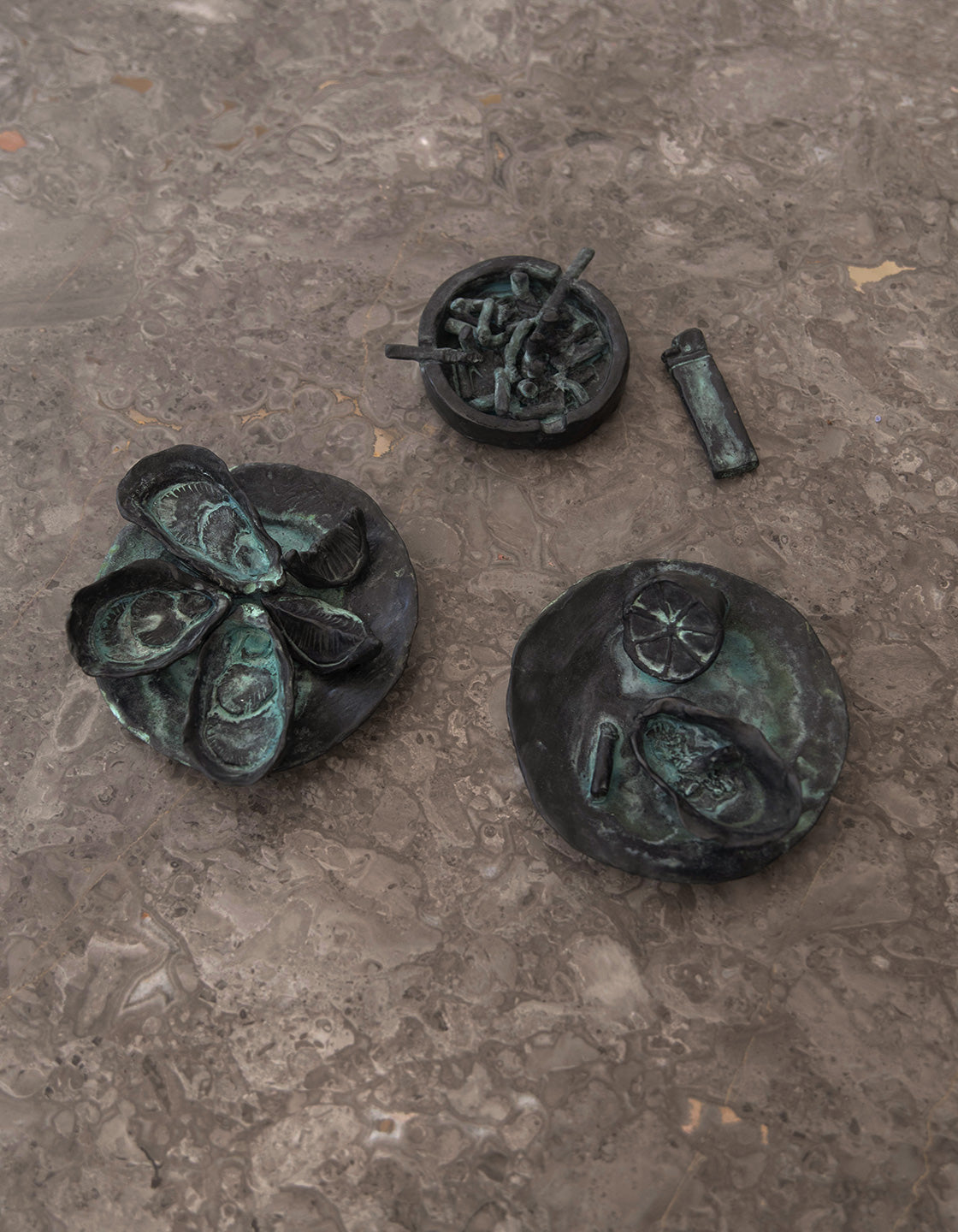 In “Ashtray and Lighter,” through her distinctive black and green patination, Rose Eken turns everyday objects into relics from the recent past. Leftovers from the night with too much to drink or too many cigarettes, or maybe just a reminder of how everyone used to smoke, Eken invites her viewers to look closely at the ashtray and cigarettes, allowing them a better understanding of the objects in their place and time.