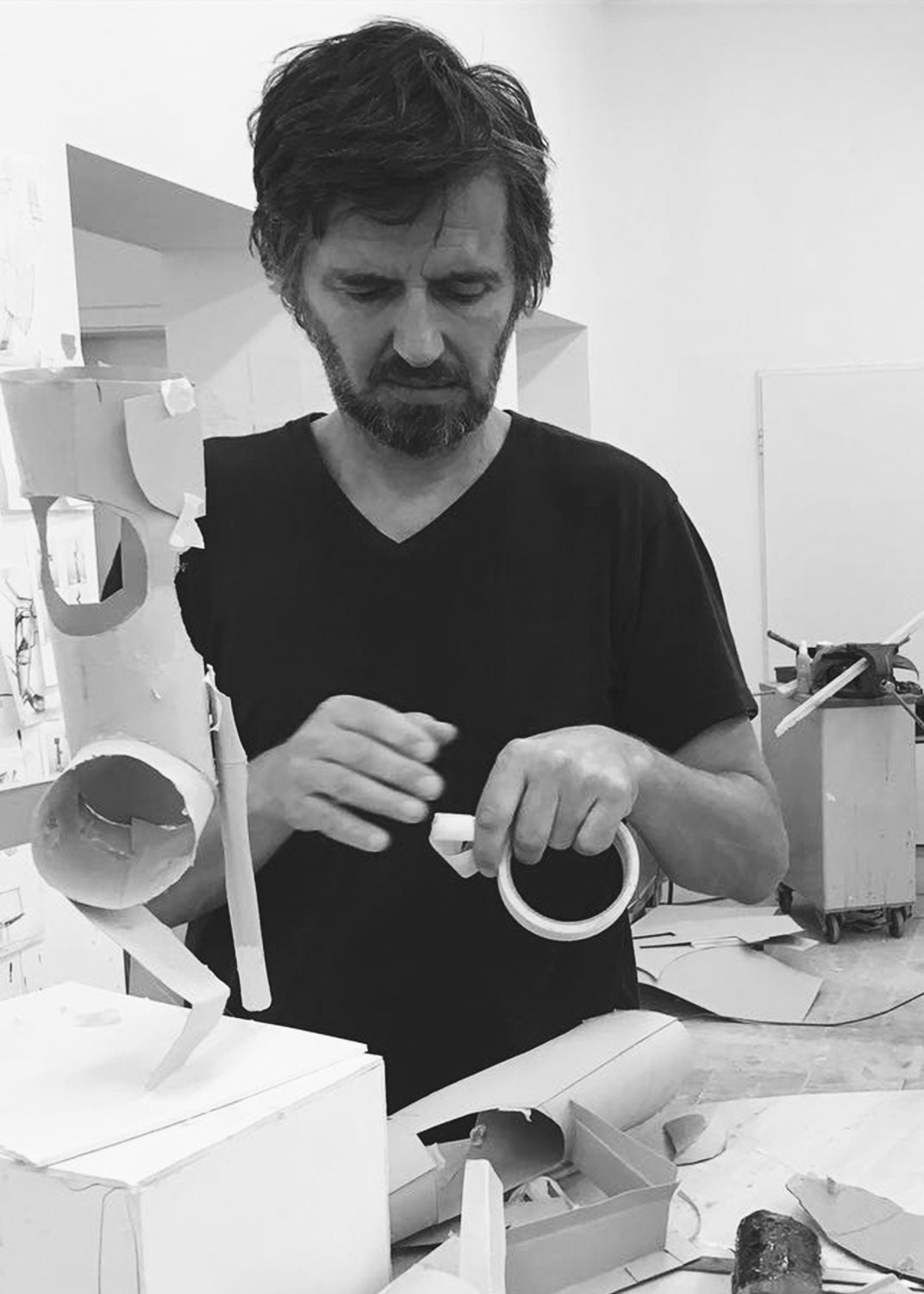 Thomas Kiesewetter crafts metal sculptures reminiscent of tabletop Cubist assemblages and Constructivist abstraction. Merging the organic with the industrial, Kiesewetter's work exudes an off-kilter, handmade quality that contrasts with the meticulousness of his fabrication process. He begins by crafting small, distinct geometric components, which he intuitively combines to form larger, spontaneous pieces.